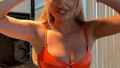 Uma jovem loira, de sutiã e calcinha laranja, mostra como come uma banana, na frente da câmera.