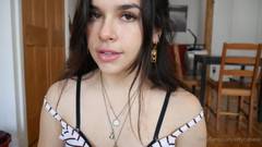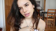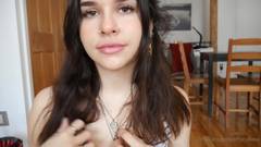 A linda morena veste meias e lingerie sexy e mostra como acaricia a buceta e os seios grandes, na frente da câmera, especialmente para você!