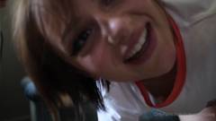 Uma jovem morena está meio deitada em uma poltrona com as pernas abertas. Ela acaricia seus peitos com uma mão e masturba sua boceta peluda com a outra