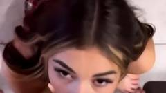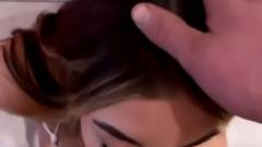 Uma jovem morena se ajoelha na frente de um homem e lhe dá uma chupada profunda no pau, que ele filma em POV e cospe em sua boca!