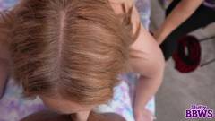 Um trio tão sujo que você precisa assistir! A ruiva gorda, com a ajuda de sua amiga cheia de tesão, chupa o pau de um cara e é fodida!