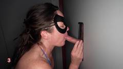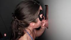 Ray Smith, uma morena mascarada, se ajoelha na frente de um gloryhole para chupar um pau e recebe 10 porções de esperma em sua boca!