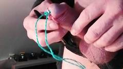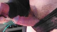 Usando calcinha de renda, esse homem insere uma haste na uretra e perfura a pele do pênis com uma agulha, tudo isso antes de uma punheta.