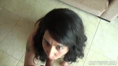 Uma morena gordinha com um belo sorriso chupa um pau e lambe a bunda, em POV.