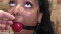 A linda negra Thiccy Niccy adora sexo BDSM. O homem amarra suas mãos por trás, coloca uma bola em sua boca, aperta seus mamilos e usa outros brinquedos