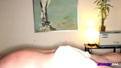Um homem idoso está recebendo uma massagem erótica. Ele está sendo massageado por uma morena jovem e bonita, com os seios nus, e ela também está chupando