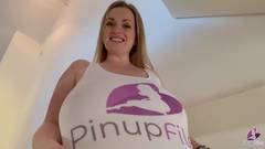 Os enormes seios naturais encantam a todos! A loira Maria Body os acaricia, toca e os revela, por baixo da camiseta.