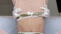 A mulher trans morena vestiu uma lingerie sexy branca, meias brancas, se arrumou na frente da câmera e mostrou uma masturbação excitante com um pau grande