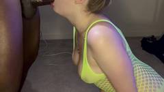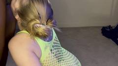 Uma mulher loira vestiu uma fantasia de rede de pesca, ajoelhou-se na frente de seu amante e chupou seu grande pênis!