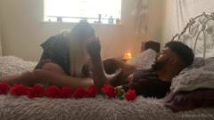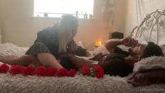 Um jovem de cabelos escuros coloca rosas vermelhas na cama para sua namorada loira. A garota o agradece sentando com a buceta no rosto dele e cavalgando