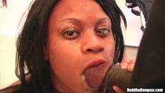 Essa mulher negra, Stacy, coloca seus peitos grandes para fora e chupa um BBC, até que ele ejacula em seu rosto.
