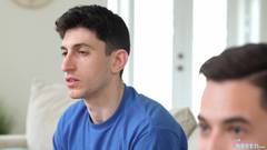 Uma sogra loira é fodida pelo enteado e pelo amigo dele, chupa os paus deles e deixa que eles a fodam em um trio quente.
