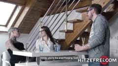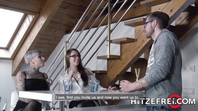A sortuda foda se diverte com suas amigas, uma lésbica com tatuagens e uma garota grossa de óculos, lambendo e dedilhando uma a outra e brincando com suas bundas.