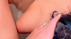 Uma beldade de cabelos azuis e uma modelo de webcam morena com tatuagens lambem a buceta e a bunda uma da outra dentro de uma banheira.