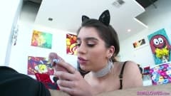 Joseline Kelly recebe uma lambida no cuzinho e, com os peitos para cima, faz sexo oral no safado até que o pau enorme dele rasgue sua garganta.