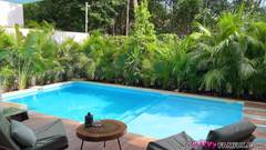 Os enteados chegam à casa deles no México. Seus pais não estão em casa, então o enteado puxa o pênis do enteado para fora e o chupa perto da piscina!