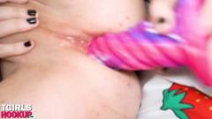 Essa transexual é fascinada por sexo anal e, quando está sozinha, enfia seu enorme brinquedo sexual na bunda na posição estilo cachorrinho diante da câmera.