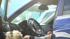 Garota loira com tatuagens prende o cabelo em um rabo de cabelo para poder chupar o pau gordo de um estranho, dentro do carro. Ela fica muito bem com um pau
