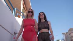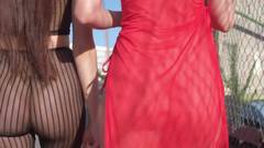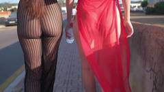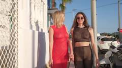 Duas amigas saíram para passear com bikinis minúsculos, mas seus peitos estavam à mostra. Como são exibicionistas, mais tarde elas vestem roupas transparentes