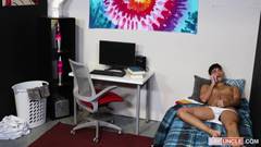 Um pai espia o filho se tocando por meio de uma câmera! Quando seu pênis está fora do lugar, o pai entra no quarto e o convence a se deixar foder por tras
