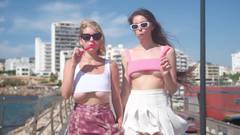 Jovens lésbicas, uma ruiva e uma loira, passeiam pela praia e pela cidade exibindo seus grandes seios e nádegas em suas minissaias que parecem muito sensuais.