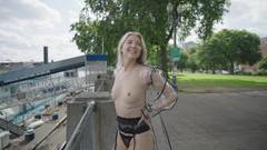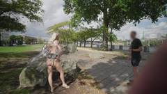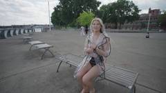 A jovem loira usa apenas calcinha. Ela cobre seu corpo curvilíneo com um casaco transparente e caminha pelo calçadão, para que todos possam ver seu corpo.