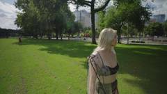 Uma jovem loira caminha nua pelo calçadão do parque para se exibir