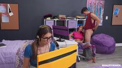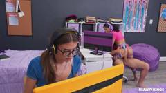 A namorada de Kai o ignora enquanto ele joga seu jogo, mas sua colega de quarto se masturba olhando para ele. Então ele puxa seu pênis gordo e deixa que ela o monte!