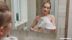 Tiffany está terminando de tomar banho quando vê sua colega de quarto, Amirah Adara, se masturbando em seu quarto. Para puni-la, ele pega o strap-on e a fode!