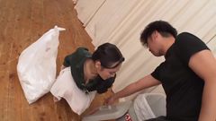 Alice não usa sutiã de propósito para mostrar seus belos peitos ao vizinho. Ela mostra suas habilidades de boquete e tem sua buceta raspada cheia de porra.
