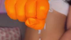 A morena calça suas luvas para meter o punho em sua bunda