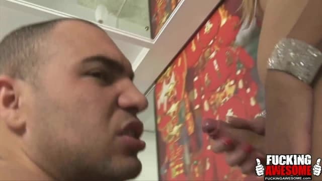 Uma loira e uma morena tesudas começam a foder este macho que lhes suga os peitos, mas um momento! Eles são transexuais e ele vai ser pego também!
