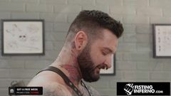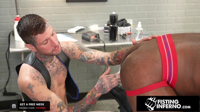 Esse negro musculoso veio fazer uma tatuagem, mas acabou se deitando e levando um soco na bunda enquanto chupava o pau de outro homem.