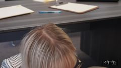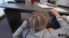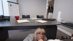 Depois de se esconder debaixo da escrivaninha, Katee V se levanta e deixa que seu colega Tony Rubino puxe sua saia para cima e a foda por trás.