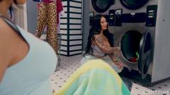Quando esta tranny encontra uma gorda e uma morena na lavanderia, tira o pau para propor que façam um trio sexual até a roupa lavar.
