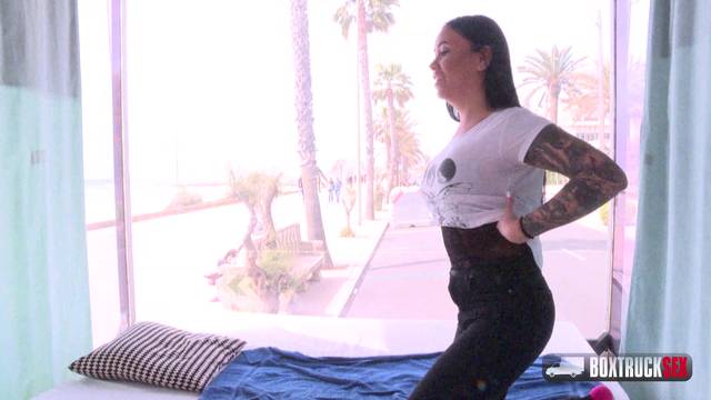 A morena Nilla Black faz massagens sensuais em um caminhão de vidro e acaba sendo fodida com força enquanto eles filmam tudo.