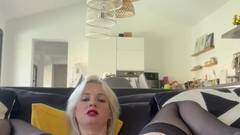 Loira francesa vestida com lingerie sexy e meias nos mostra seus peitos fartos e usa um vibrador grande para esticar seu cuzinho apertado