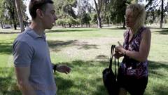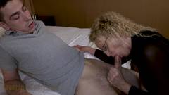 A velha loira está com um rapaz jovem que lhe dá uma chupada