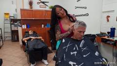 Connie Perignon, curvilínea e grossa, transa na barbearia com Mick
