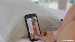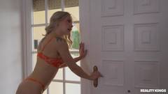 A loira excitada Angie Lynx sente falta do pau grande de seu ex, enviando-lhe fotos de lingerie. Ele chega em casa rapidamente e ela chupa e monta em seu pau!