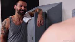 Scott DeMarco e David Benjamin não perdem tempo conversando no vestiário. David se ajoelha e começa a chupar Scott...