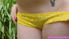 É ao ar livre que esta jovem morena com grandes mamas fica nua diante das câmeras e toca sensualmente seu corpo!