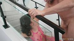 A safada da Nat, em uma rede de pesca rosa, fica suja com Vince Karter em uma escada, engolindo profundamente seu grande pênis e levando-o com força.