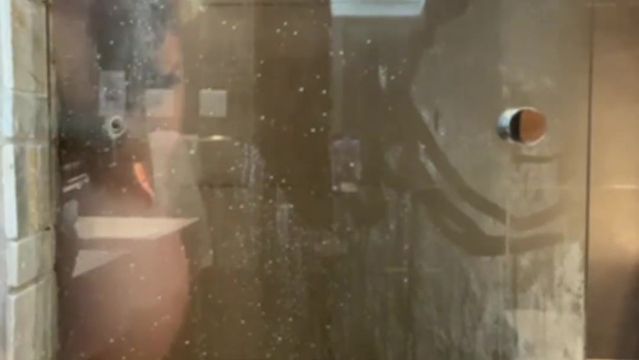 A água quente corre pelos seus corpos nus, enquanto ele a fode brutalmente de quatro, gemendo alto, o cu azotado pela água até a gozada