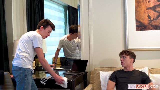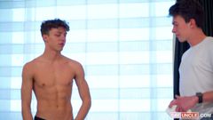 Ao procurar algo embaixo da cama, esse jovem fica preso. Então, seu meio-irmão se aproveita e começa a chupar sua bunda e depois o fode.