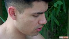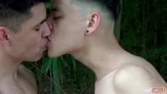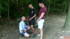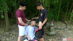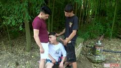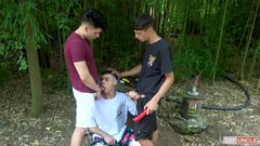 Três gêmeos latinos na floresta chupando as picas uns dos outros com prazer