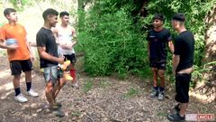 Esses dois foram flagrados pelo resto da equipe chupando pau, então agora todos se juntam a eles, criando uma orgia gay em um parque público.