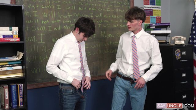 Estudantes gays fazem sexo oral uns nos outros em uma sala de aula vazia
