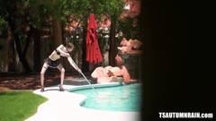 Sua vizinha tranny a vê limpando a piscina e a convida a entrar