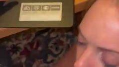 Ela surpreende o seu homem trabalhando no computador e se agacha para mamar o pau dele de maneira especial enquanto ele grava tudo em POV, até as tetas dela